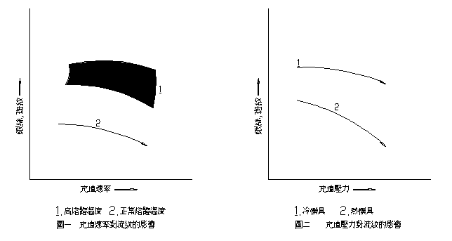 圖二表示增加充填壓力可以減少流紋的情形,這在高模溫時最有效.消除流紋是一件費力而不易見效的事,最好是避免產(chǎn)生氣泡的根本原因,如此就不必再要求消除流紋了.對有待電鍍或油漆的塑件,或者將浸泡在熱水或溶劑中的塑件,就毋需采用消除流紋的方法.