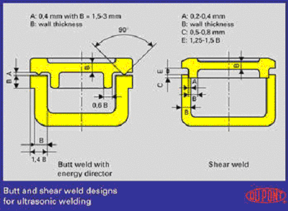 半結(jié)晶聚合物熔點(diǎn)變化劇烈,當(dāng)加熱時,聚合物瞬間從固相轉(zhuǎn)變成液相。因此,對半結(jié)晶塑料的超聲焊接中,最好使用剪切焊接(圖5)。由于非晶態(tài)塑料有一個軟化范圍,所以非晶態(tài)塑料的焊接設(shè)計相對次要些。圖6給出近聲場和遠(yuǎn)聲場焊接方法的示意圖?恐佑|點(diǎn)之間距離的不同,超聲波將擺動傳至工件內(nèi),并使接觸面間粘合連接起來?偟恼f來,近聲場焊接對所有塑料都會有很好的效果。對于低彈模數(shù)塑料的焊接最好采用近聲場焊接方法。