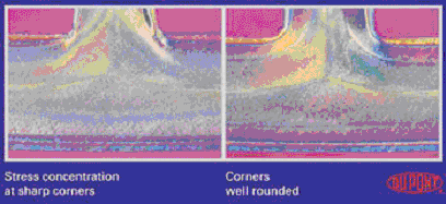 如果給一個有的組件以負載,則的底部可能會產生應力。在這一部位如果沒有圓弧,可能會產生非常高的應力集中(見圖3),通常會導致組件的斷裂和報廢。補救措施是建立一個半徑足夠大的圓弧(圖1),使肋底部建立更好的應力分布。