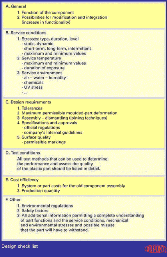 塑料的性質(zhì)受使用環(huán)境、加工過程、模具設(shè)計和操作條件的影響(如圖1所示)。塑料性質(zhì)由實驗室環(huán)境下的測試得到。測試圖由具有優(yōu)化參數(shù)的高光度模具,在規(guī)定壓力的標準條件下檢測產(chǎn)生的。然而,實際上,塑料不可能恰好在這樣的條件下生產(chǎn),在使用中也不可能正好在同樣的壓力下。因此,在推出任何塑料設(shè)計方案的時候,其精確的要求和界定條件必須仔細地分析和羅列出來,設(shè)計核對表在這方面可以提供有用的幫助。