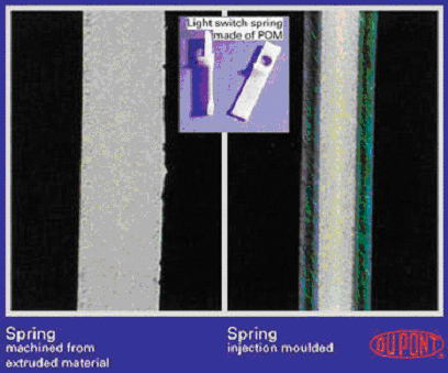 由擠出材料制成的用于電燈開關(guān)的樣品,可以承受180000次周期性應(yīng)力。而同樣情況下,注塑部件在80000次之后就出現(xiàn)了疲勞破壞。這種差異是由于在注塑過程中晶體結(jié)構(gòu)的不同所造成的。