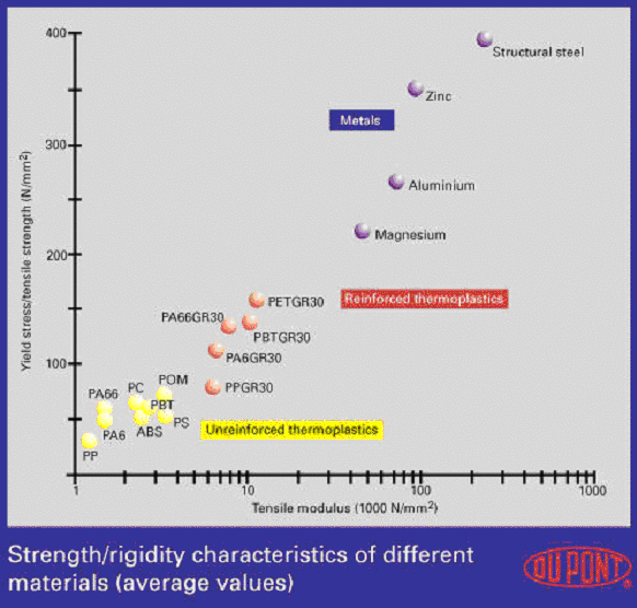 塑料原材料比起其他任何工業(yè)原材料,其特性可在很大的范圍內(nèi)變化多端。通過添加填料、增強(qiáng)材料和改性劑,其性質(zhì)會(huì)產(chǎn)生很大的轉(zhuǎn)化。大多數(shù)塑料的基本性質(zhì)與金屬有著明顯區(qū)別。例如,通過直接對(duì)比,金屬具有更高的。