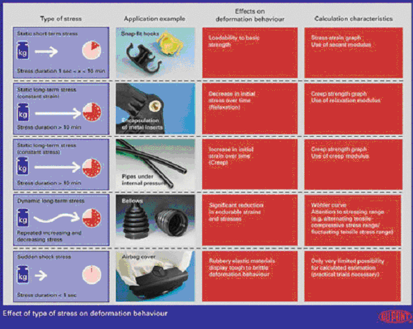 如果使用溫度與形變率變化很大,工程熱塑性塑料的性質(zhì)也可以由硬脆向彈性變化。例如,安全氣袋張開門,在實(shí)際應(yīng)用(如爆炸性開啟)的過程中,其形變表現(xiàn)與慢速組裝配件的形變表現(xiàn)質(zhì)完全不同(如圖2)。同樣的,卡扣配件也必須隨著溫度的冷熱來選擇不同的裝配方法。這里,溫度的影響遠(yuǎn)遠(yuǎn)大于裝載速率的影響。