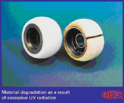 塑料的特性不僅僅是純?cè)牧系男再|(zhì)。在不同操作環(huán)境下,塑料組件的基本性質(zhì)會(huì)隨著不同的因素而改變(如紫外光輻射,如圖3)。如果原材料在不適用的范圍內(nèi)加工,再好的設(shè)計(jì)也會(huì)失敗。同樣的,制品并不能以加工過程來解決設(shè)計(jì)弱點(diǎn)。因此只有考慮到所有因素的優(yōu)化工藝,才能保證塑料零部件的質(zhì)量。