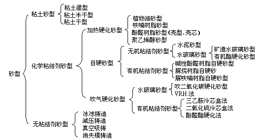 鑄造主要工藝過程包括:金屬熔煉、模型制造、澆注凝固和脫模清理等。鑄造用的主要材料是鑄鋼、鑄鐵、鑄造有色合金(銅、鋁、鋅、鉛等)等。鑄造方法常用的是砂型鑄造,其次是特種鑄造方法,如:金屬型鑄造、熔模鑄造、石膏型鑄造......等。而砂型鑄造又可以分為粘土砂型、有機粘結(jié)劑砂型、樹脂自硬砂型、消失模等等,如下圖:
