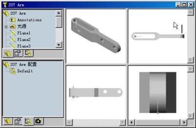 2.窗口的分割:雙擊或拖動(dòng)窗口分欄線,可以將同一窗口進(jìn)行分割,以便于在不同的窗口中觀看模型的不同視圖。對(duì)左側(cè)窗口進(jìn)行分割可以同時(shí)顯示不同的內(nèi)容,如FeatureManager設(shè)計(jì)樹、PropertyManager屬性管理器或ConfigurationManager配置管理器,如圖1所示;