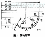 我廠生產(chǎn)的YJH256液力變矩器泵輪外環(huán)(見圖1),就屬于此種類型零件,為適應生產(chǎn)需要,設計了如圖2所示的拉深模具。