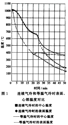 形狀復(fù)雜的較大工件從高溫連續(xù)進(jìn)行快速冷卻時容易產(chǎn)生變形甚至裂紋。以往可用鹽浴等溫淬火解決。在單室真空高壓氣冷淬火爐中能否進(jìn)行氣冷等溫淬火呢?圖1為在帶有對流加熱功能的單室高壓氣冷淬火爐中對兩組φ320mm×120mm兩塊疊裝的碳素結(jié)構(gòu)鋼用不同冷卻方式淬火后的對化結(jié)果。圖中一組曲線是在102O℃加熱后,在6×105Pa壓力下連續(xù)用高純氮?dú)饫鋮s(風(fēng)向是上、下相互交替,40s切換一次)的結(jié)果。另一組是對試樣表面、心部進(jìn)行370℃時的控制冷卻。從兩組曲線的對比可以看出,心部溫度通過50O℃的時間(半冷時間)只差約2min。從表面進(jìn)行控制冷卻開始到心部溫度到達(dá)370℃附近,需27min。由此可見,在單室真空高壓氣淬火爐進(jìn)行等溫氣冷淬火是可行的。